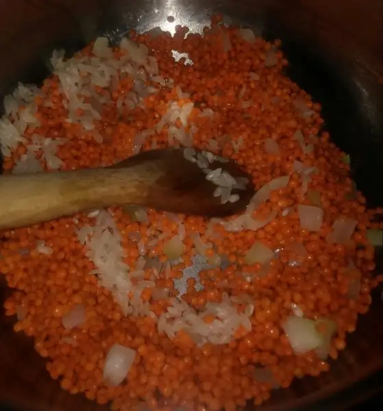 Oncelikle soganimizi 2 yemek kaşığı siviyag da az kavuruyoruz.ardindan yıkayıp süzdüğümüz mercimeklerimizi pirincimizi ilave ediyoruz.