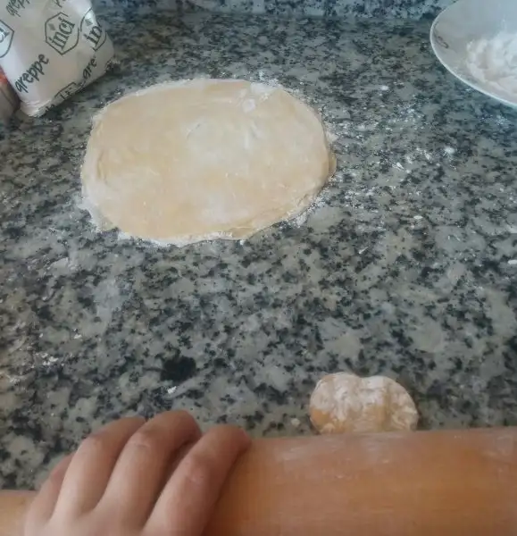 ilk 10 bezemi sırasıyla nisasta ekleyerek tabak büyüklüğünde merdane yardimiyla tek tek açıyorum.açtığım yufkalari ust uste arasina nisasta surerek koyuyorum.nisastayi kararinda yapmazsanız hamur birbirine yapisabilir.ne az olsun nede cok.ilk 10 katı sirasiyla açıp diziyorum