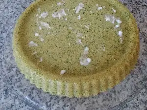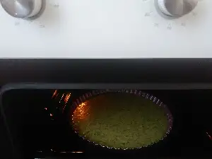 Kalıp telin üzerine değil de fırın tepsisinin üzerine konulur ki kekin rengi yeşil olsun.(Benim ıspanak miktarı az geldiği ve de pişirme süresini uzun tuttuğumdan dolayı dışı hafif kızardı ama içi yeşildi)