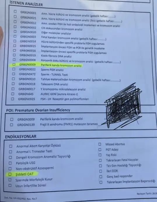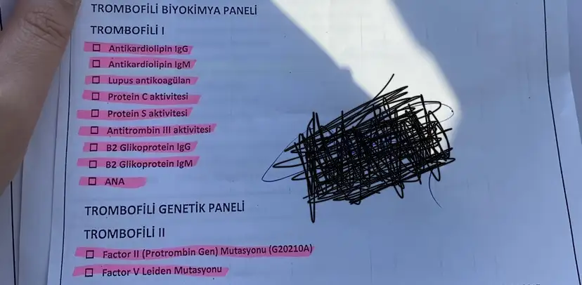 Şişli memorialin ön görüşme sonrası benden(pembe kalemle çizilmiş olan) eşimden istediği (sarı kalemle çizilmiş olan) testler. Eşimin sperm sayısı çok düşük olduğu için istenmişti kromozom analizi.