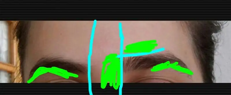 Bak şimdi göz pinarlarindan alnina dogru paralel iki dikme ciktigini hayal et mavi çizgiler onlar. Yeşille boyadigim alanlar alman gereken yerler. Aykiri olan sana göre sol kasinin ustundeki yesil alani da makasla kesmelisin. Sonrasinda da kaslarin altindaki yesil alanlari almalisin. Kaşı ustten inceltme. Hep alttan incelt ki gozunle arasinda mesafe açılsın. Yoksa kaş asagi duser. Ama tabi alınla kaş arasinda muhakkak tüyler vardir onlari alabilirsin.