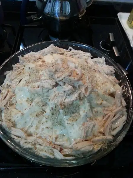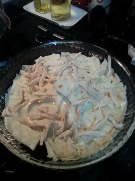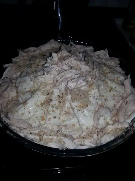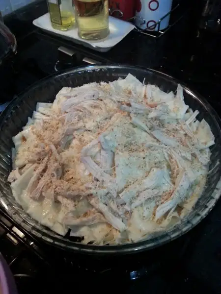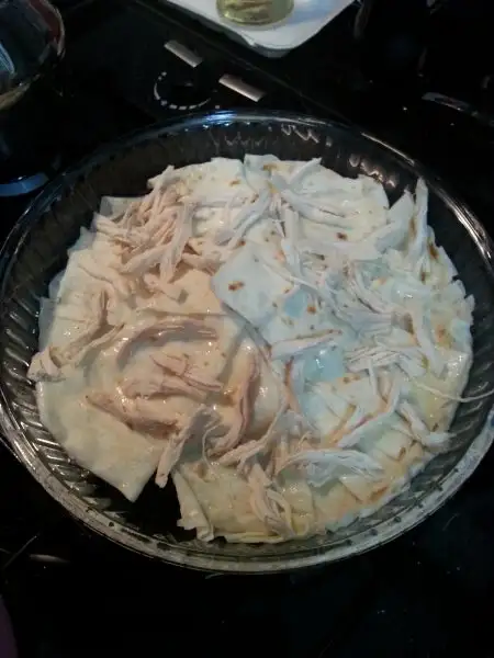 tepsinin tabanına yufkaları tavuk suyuna bir kez daldırıp çıkarıyoruz 1 sıra diziyoruz üzerine erittigimiz yağdan gezdirip tavuk serpiştiriyoruz