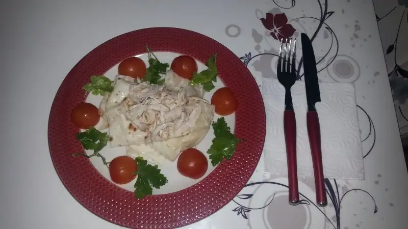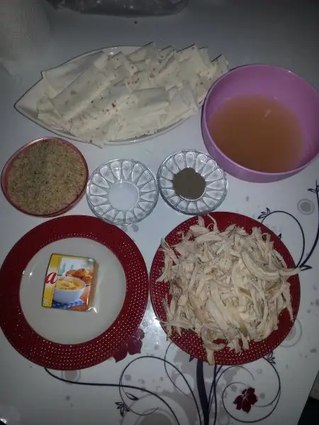 Sıra pişen tavukların parçalanıp yufkaya sarılarak tepsiye dizilmesine gelmiştir.Ardından yağlı tavuk suyuna bandırır kestiği yufka sarımlarını.