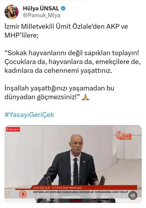 "Dünya Sağlık Örgütü raporlarını okuduk. Tarım ve Orman ile Sağlık bakanlıklarımızın raporlarını okuduk. Grup Başkanvekilimiz Bahadır Yenişehirlioğlu başkanlığında akademisyenleri, sanatçıları, hayvanseverleri, mağdur aileleri, evladı, kızı vefat edenleri dinledik. Bu ölçüler ışığında teklifi hazırladık. Teklifin hayırlar getirmesini diliyorum. Belediye başkanlarımıza güçlü destek veriyoruz. Barınakları kurun. Kısırlaştırma seferberliği yapalım, aşılayalım. Vicdanlarınıza sesleniyorum, barınakları kurun."