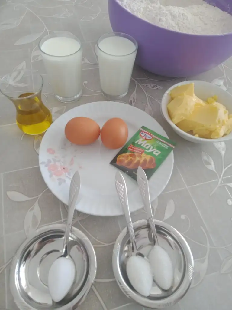 Süt, şeker, maya yoğurma kabına alıp karıştırın.