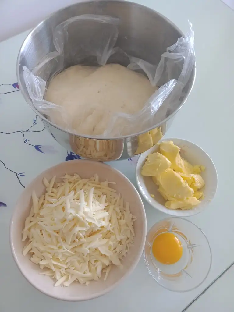 Hamur toparlanınca tezgaha alıp yaklaşık 8,10 dk iyice yoğurun. Robotunuz varsa robotta da yoğurabilirsiniz..Ben robotta yoğurdum. Üzerine streç film kapatıp 40 dk mayalandırın.