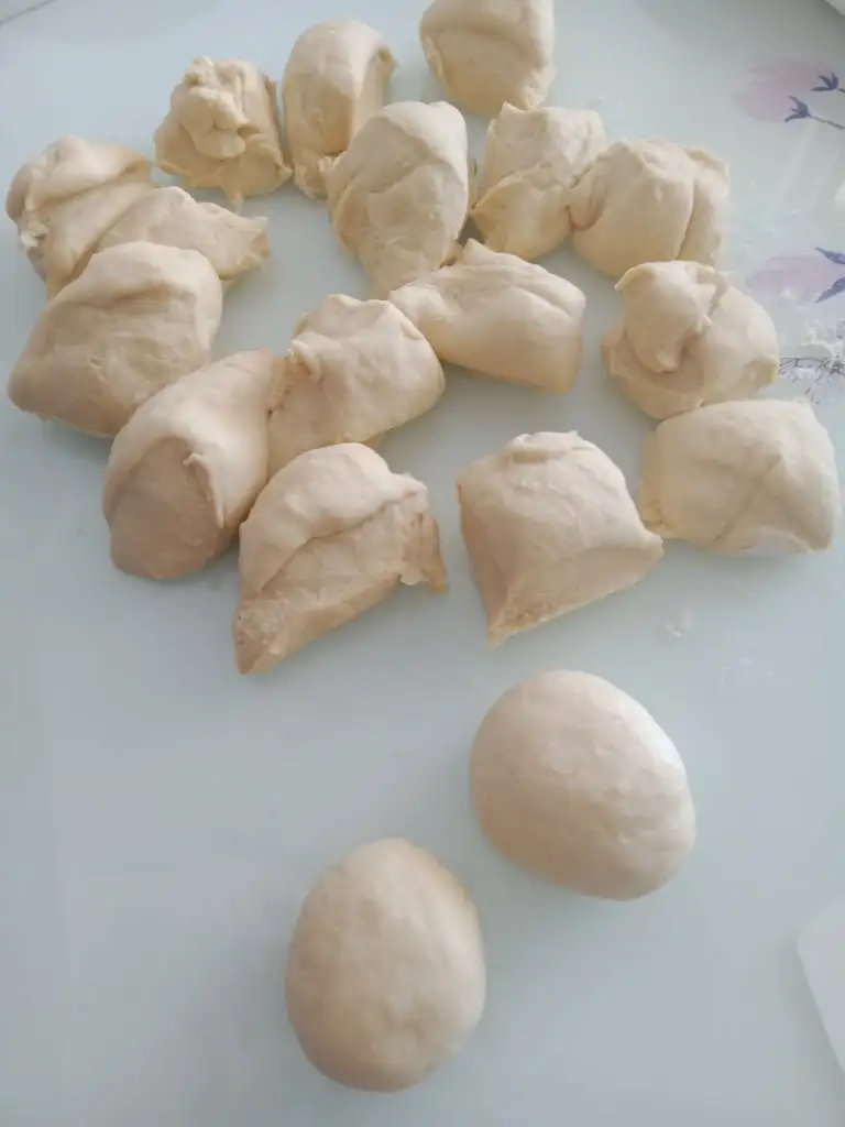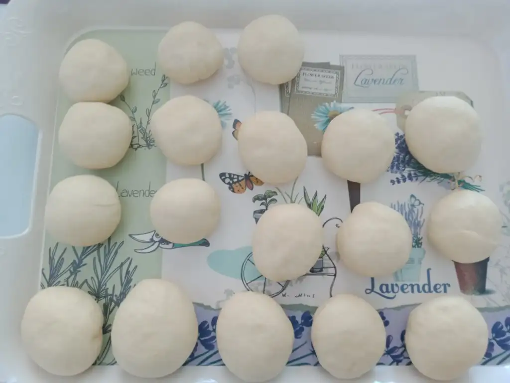 Mayalanan hamurun gazını almak için bir iki yoğurun daha sonra hamuru 2 ye kesin. Her 2 parçadan da 9 ar eşit beze çıkartın.