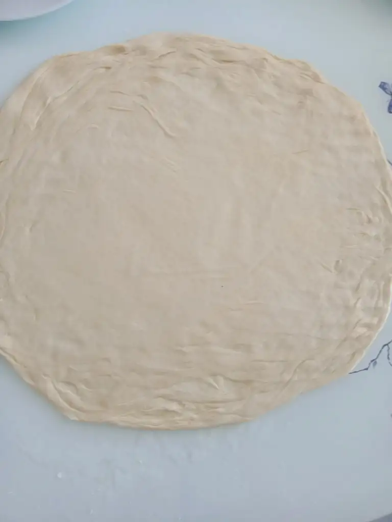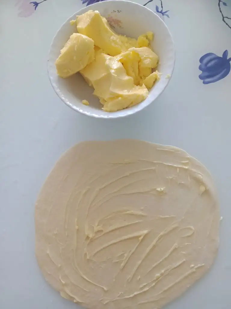 Bu hazırladığınız hamuru bir tabağa alıp buzluğa kaldırın. Bu arada diğer hamurlara da aynı işlemi yapın ve buzluğa kaldırın.. (Yani buzlukta birkaç dakika soğutmak yeterli hamuru daha güzel ve kolay açmaya ve aralarının daha belirgin kat kat olmasına yarıyor)