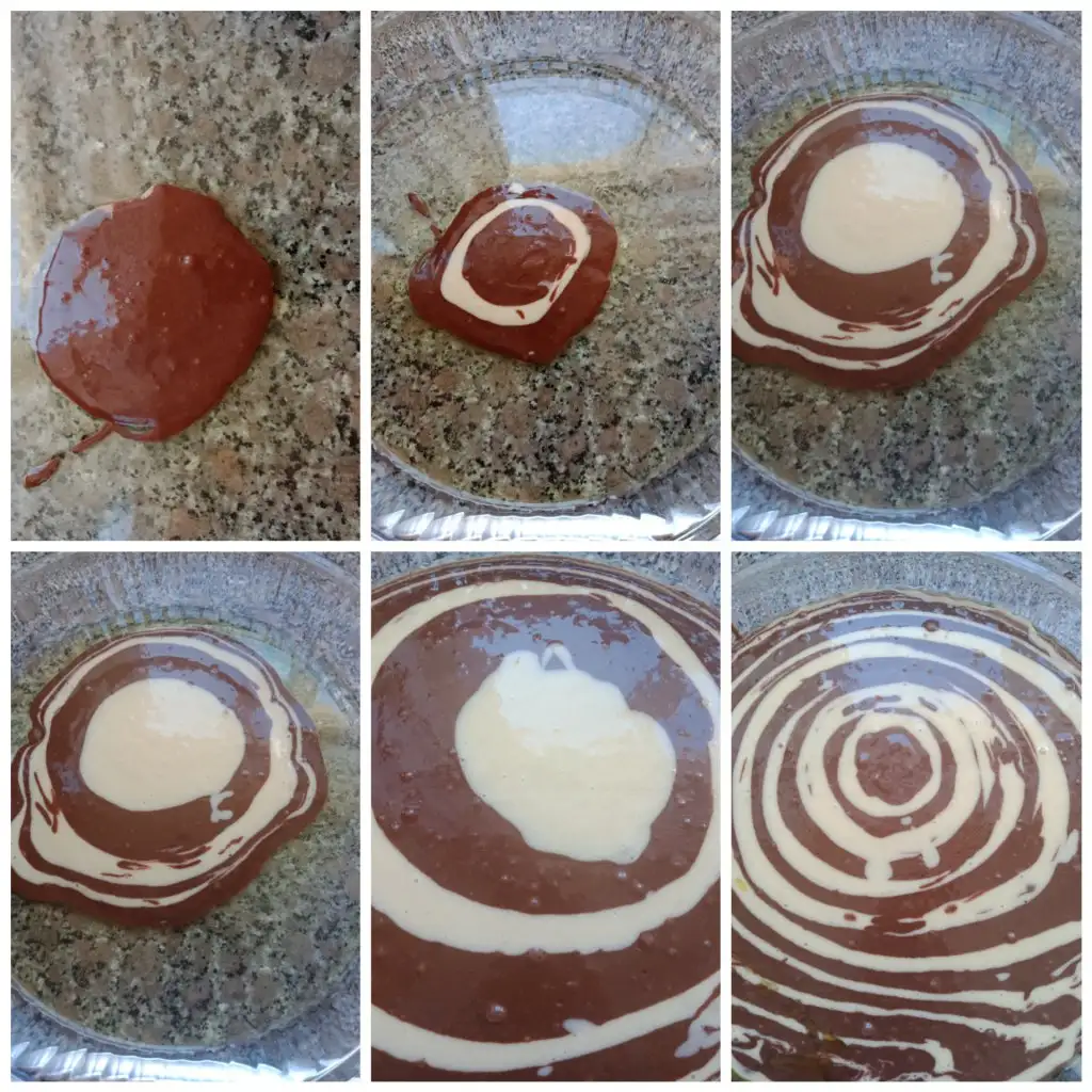 Yaklaşık 22-23 cm çapındaki yağlanmış yuvarlak tepsinin tam ortasına hamurlardan sırayla 3 er yemek kaşığını dökün (yani 3 yemek kaşığı kakaolu, 3 yemek kaşığı vanilyalı).
