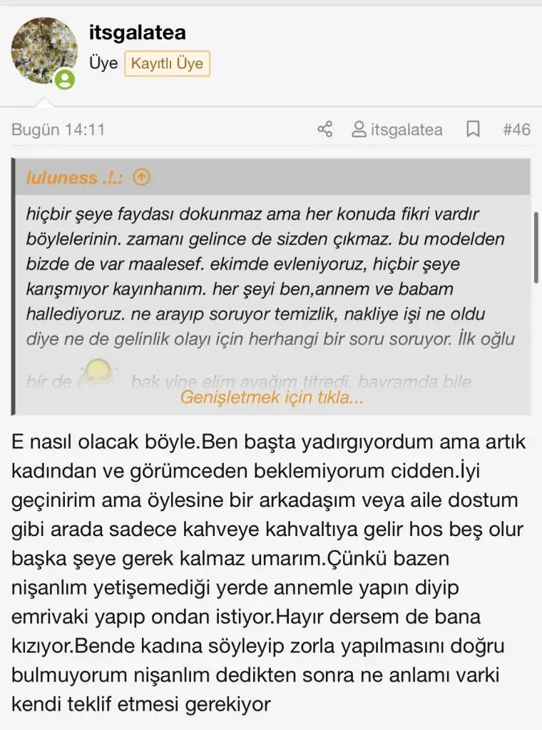 Öyle işte kızlar.İçimden bir o ilk kopuş koptu kayınvalideye karşı kimbilir neler göreceğim orası ayrı mesele ama size anlatayım dedim nasıl yapsam sonrası İçin davransam bilemedim artık.Böyleli işte…