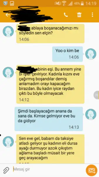 dur canım dur panik yapma. sana tam da bu yüzden evden çıkma aileni doldur eve demiştim. kadının niyeti belli sizi boşatıp oğluyla eve yerleşecek. panik yapma. eşini ara olanları anlat çıkın ikiniz evden otele gidin. canım bak eşinle kv yi yalnız başbaşa bırakma evde aslaAnlayabilen var mı eşim eve geç boşanıyoruz demişler dedi. Sinirden elim ayağım titredi valla. Şimdi babamı bekliyorum beni götürecek