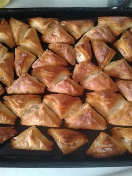 *Üzerlerine önce hazırladığımız muhallebi daha sonra da iri kıyım cevizlerden yerleştirip üçgen şeklinde katlıyoruz