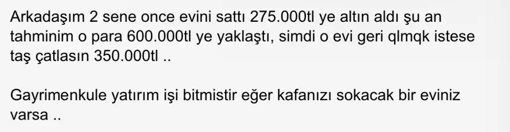 Vaktiyle babam arabasını satıp dolar almıştı. Birden dolar arttı. Hem aynı arabayı aldı hem artanla yatırım yaptı. Cevredekiler de baktı dolar çok kazandırıyor. Dolar aldılar. Tabi ki zarar ettiler. Su an zaten artmış bir şey sürekli artacak diye bir şey yok. Ev de belki artmaz ama iki şeyin değeri aynı olur. Yani evler düşerse sizin alacağınız ev de düşer. Ama altın her anlamda risk. Banka kasasından çalınan altınlar bile var bu ülkede. Saklaması ayrı dert. Saklamak için masraf da olacak. Evin kira geliri yine devam edecek.