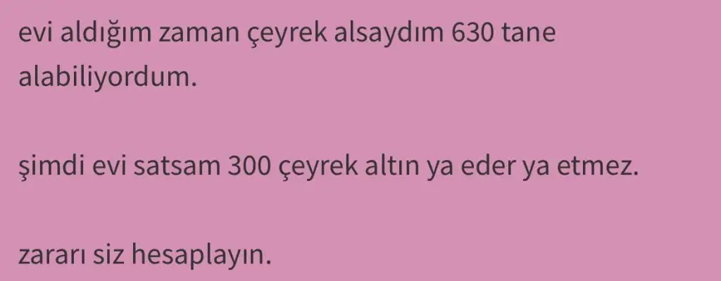 Valla ettirdi işte. Evi 460a aldık şimdi ederi taş çatlasa 900k. O parayı evi aldığımız dönem altına yatırsaydık 1m200k civarı para ediyor. Bakın daha fazla kâr etti. İmkansız değil bu neden bu kadar şaşırılıyor anlamıyorum