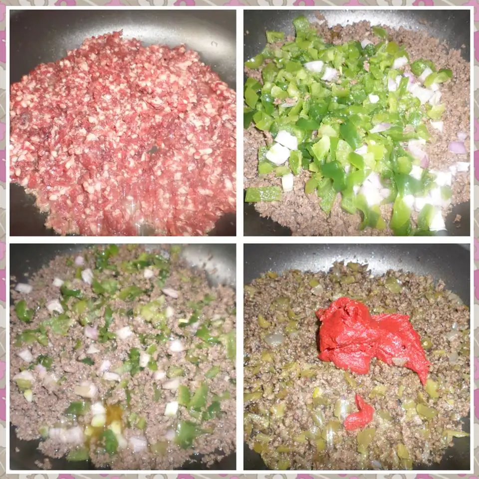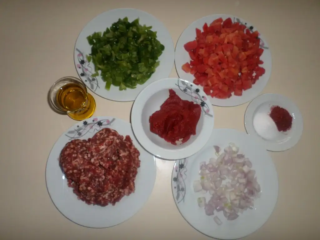 Kıyma tavaya konur ve üzerine 1/2 çay bardağı su eklenerek pişirilir..Daha sonra sıvıyağ ve doğranmış soğan ile biber eklenir,kavrulur .Kavrulan harcın içine salça eklenir ve kavrulmaya devam edilir..