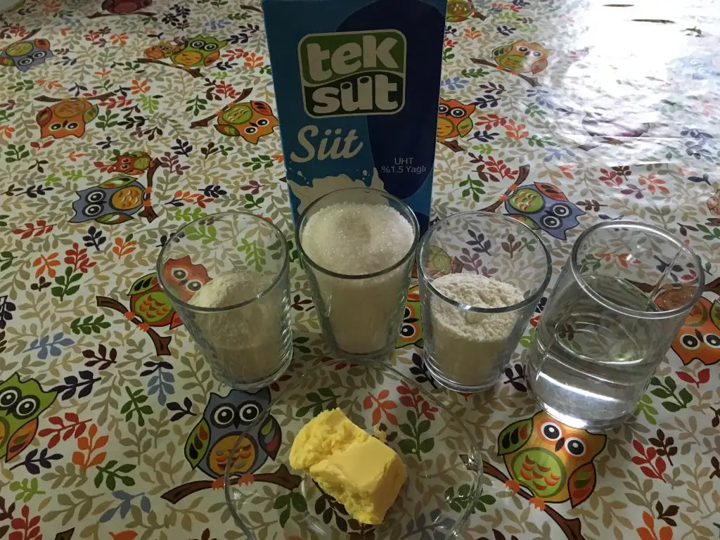 1 litre süt ile 1 bardak toz şekerimizi bir tencereye alıp, ocağa yerleştiriyoruz.