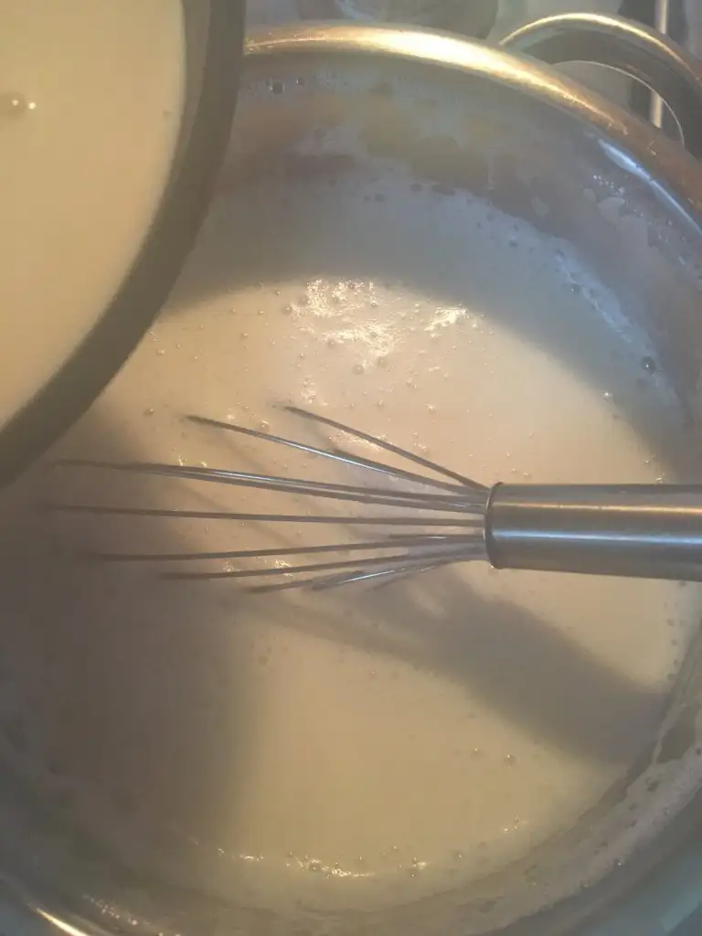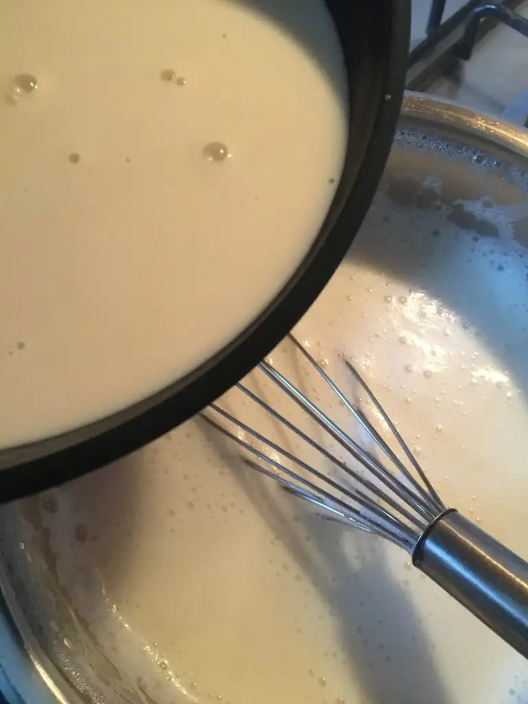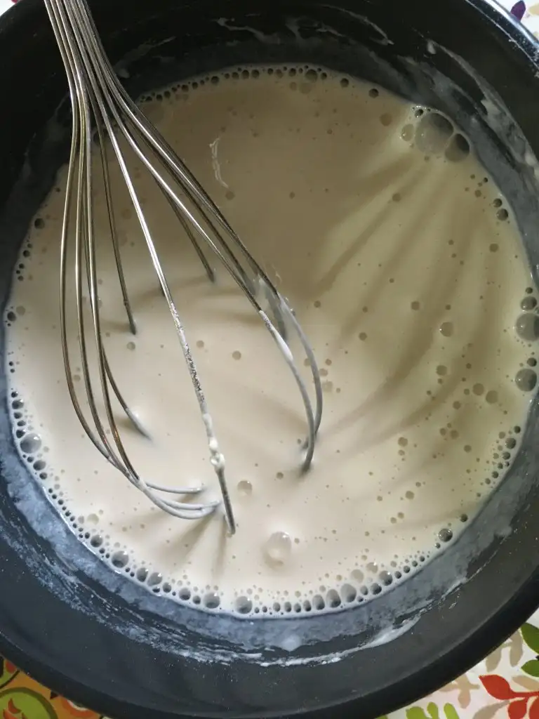 Kaynayan şekerli süte, hazırladığımız unlu karışımımızı çırparak kaynatıyoruz. İndirmeye yakın tereyağını ekleyip, iyice çırpıyoruz.