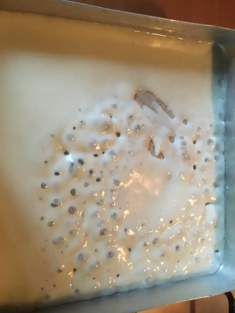 Muhallebimizi mikser yardımı ile çırpıp, dibi tutmuş tepsimize döküyoruz ve en az 6 saat dinlenmeye alıyoruz.