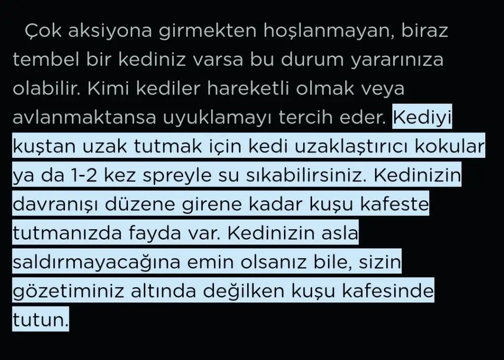 Bence bu durum kediden kediye değişiyor, benim british kedim var ama kuşuma asla alışamamıştı. Bu arada bizim veterinerimizin tavsiyesi zaten kuş ve kediyi yalnız bırakmamaktı, sadece av olarak gördüğü için değil aynı zamanda hareket ettiği için kedinin dikkatini çekiyor kuş. Oyun oynamak için de yakalamak isteyebiliyor