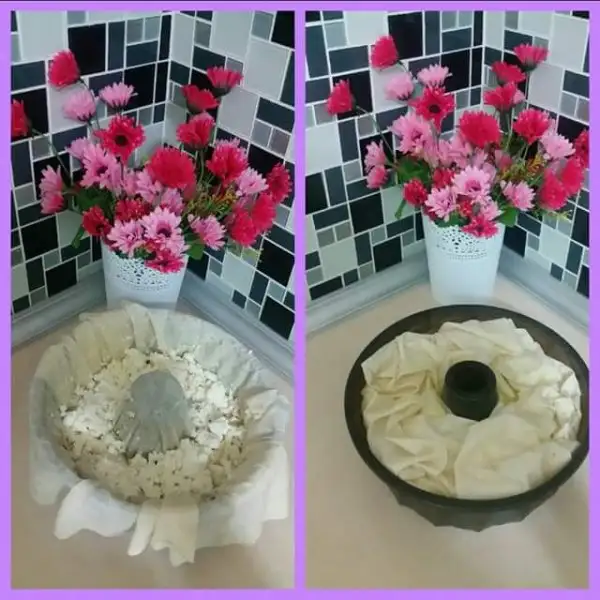Not:Eğer susam veya çörekotu kullanmak isterseniz kek kalıbını yağlar yağlamaz hemen susamınızı yada çörekotunu kalıbın içine serpmelisiniz ki üzerine yufka koyacağımız için piştikten sonra böreğin üst tarafında olsun.