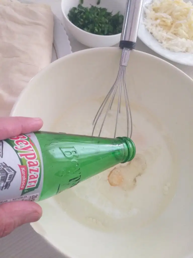 - Böreğin sosu için bir kasede süt, soda, yumurta ve sıvı yağı karıştırın.