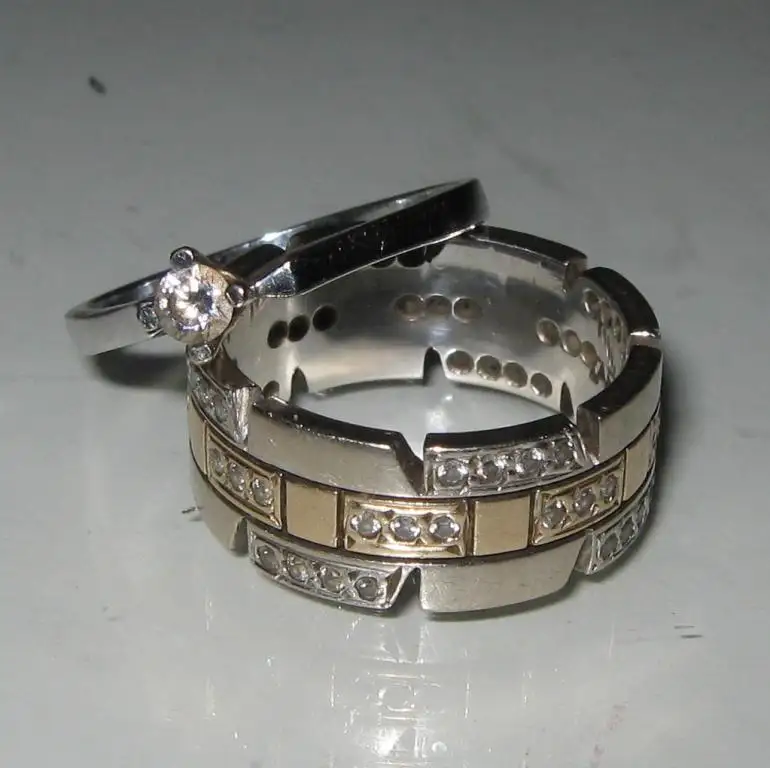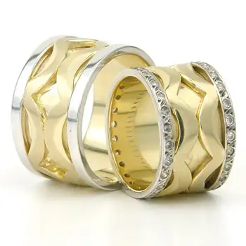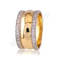 bizim alyansımızda bundan ama ortadaki sarı azıcık daha ince kenardaki beyaz taşlarıda daha belirgin ışıltılı ve ortaya göre yüksekte kalıyor. benim çok severek aldığım bir yüzük. taşlarıda henüz düşmedi oysa parmağımdan hiç çıkarmam