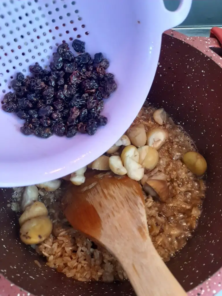 Kabuğundan ayırdığımız kestaneleri ekliyoruz . Hemen peşine kuş üzümlerini ekliyoruz