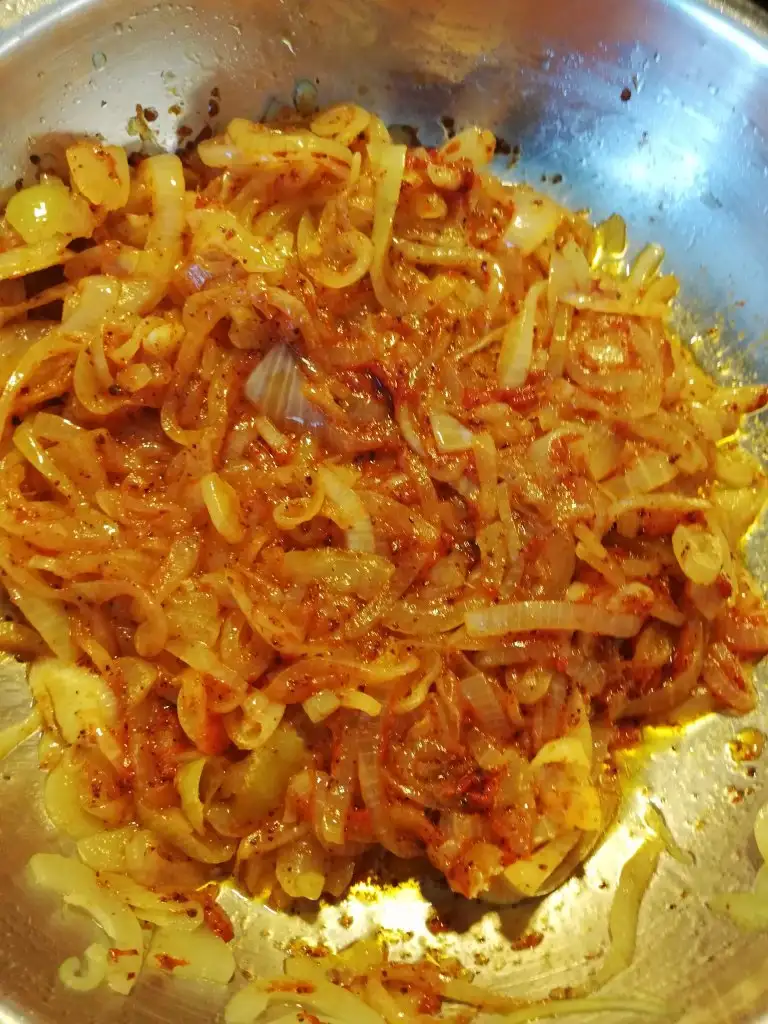 Biraz zeytinyag ve biraz tereyag ile soganlari dilimleyip kavuruyoruz