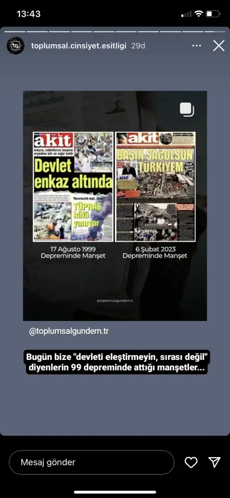 Peki kahve pembe sorum şu; ''1999 öncesiyse yıkılan binalar nasıl 2 yıl önce 2.950.000 tl gibi uçuk bir rakama yeni bina diye satışa sunuldu.'' Yıkılan binalar arasında çoğu 2-3 en fazla 5 yıllık binaydı teorine göre 2003 yılında mıyız? Sel bölgesine kurulan çadırlarda 99 öncesi miydi? Ve en önemli sorum; İstanbul'da sel deprem olunca ya da İzmir'de belediyenin gerekli önemleri almadığı öne sürülüyor ama Gaziantep, Kahramanmaraş gibi 11 ilimizin olduğu illerdeki felaket nasıl Allah'ın takdiri oluyor. Küçücük çocukken hafız anneannemin bana öğrettiği en güzel şey Allah her canlıyı yarattı ama insanlara fark olarak akıl verdi aklını kullanmazsan hiç bir suçu veya olayı kadere ya da Allah'a bırakamazsın derdi. Sen sınavına çalış çabala derslerini dinle ödevlerini yap sınava girerken bir aksilik olmaması başarının karşılığını almak için dua et sen çabaladığın halde bir aksilik çıkarsa kısmet böyleymiş dersin derdi. Şimdi neye çabaladık da yok 99 öncesi yok 2000 sonrası tartışması yapıyoruz. Yakınlarını kaybeden insanların hakkı kalır mı sence? Deprem vergileri 99 senesinden sonra toplanmaya başladı peki nerde yardımlar nerde ?