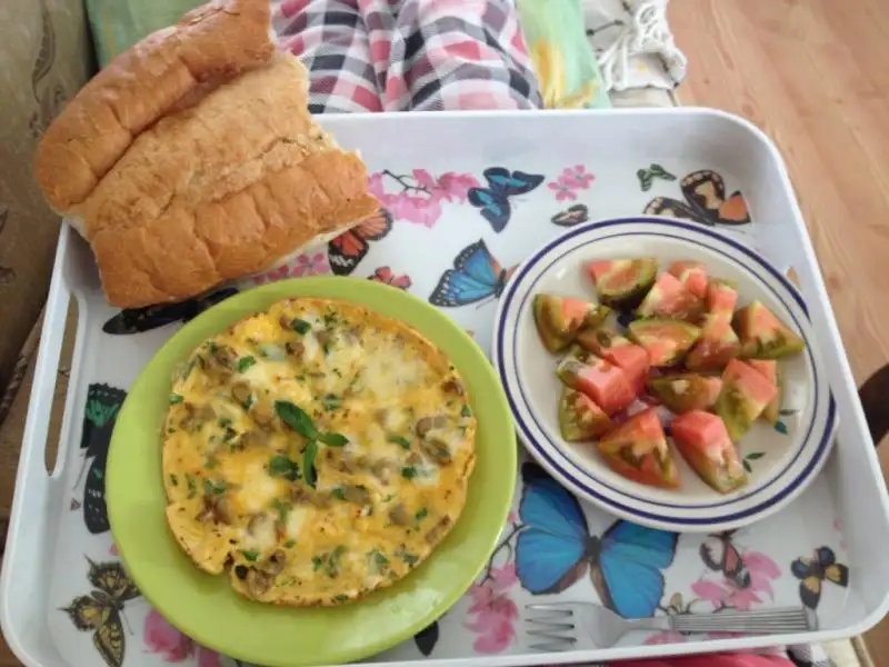 iki yumurta, iki dilim peynir, 7-8 yeşil zeytin, maydanoz ve nanelerden oluşan omletim