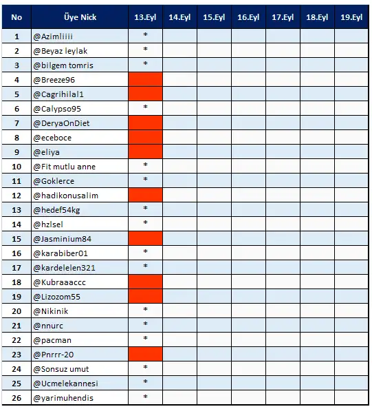 No Üye Nick 13.Eyl 14.Eyl 15.Eyl 16.Eyl 17.Eyl 18.Eyl 19.Eyl 1 Azimliiii * 2 @Beyaz leylak * 3 @bilgem tomris * 4 @Breeze96 5 @Cagrihilal1 6 @Calypso95 * 7 @DeryaOnDiet 8 @eceboce 9 @eliya 10 @Fit mutlu anne * 11 G Goklerce * 12 denizbenimadim 13 Hedef60kgolmak * 14 hzlsel * 15 Jasminium84 16 @karabiber01 * 17 @kardelelen321 * 18 @Kubraaaccc 19 Lizozom55 20 @Nikinik * 21 @nnurc * 22 pacman * 23 @Pnrrr-20 24 @Sonsuz umut * 25 Ucmelekannesi * 26 yarimuhendis *