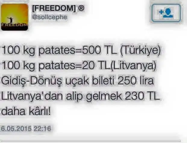 kito_'nun paylaştığı haber benim söylediklerimi destekliyor, mahsül çiftçide ucuz, tarım ve hayvancılık desteklense, devlet yeterli ödenek çıkarsa ki sanırım tarım ve hayvancılığa yeterli bütçe ayrılmıyor, mazot, gübre vb ihtiyaçları ucuza karşılasa köylü ve aracısız malını satabilme imkanı tanınsa, halk 5 liradan yemez patatesi.