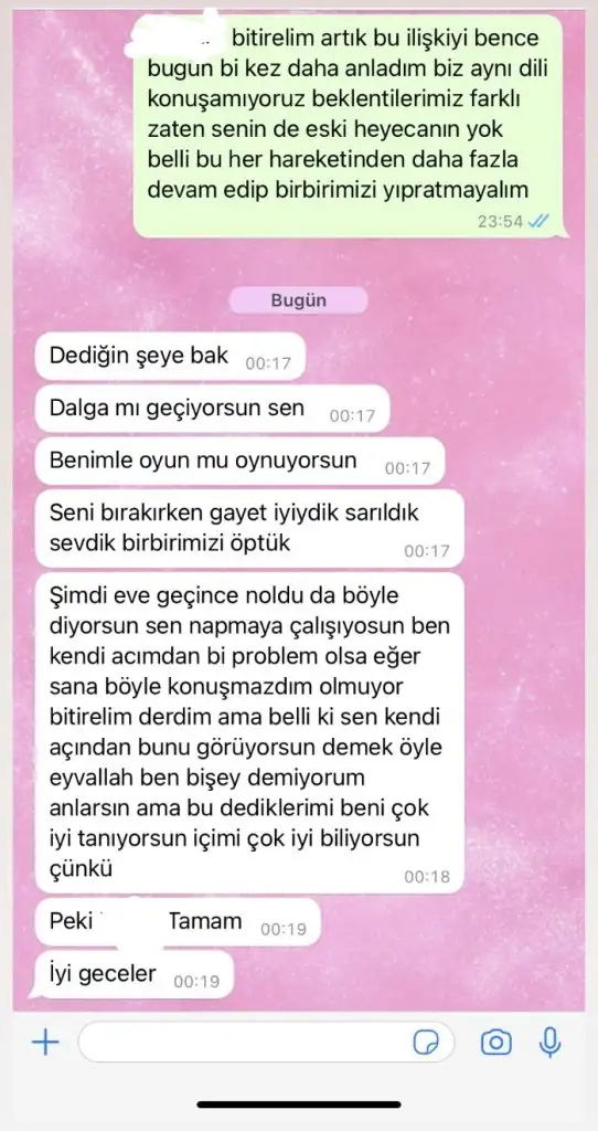 Çok kaba buldum bazı cümlelerini, çocuk sıkılmış gibi duruyor, ayrıl derim.Eki Görüntüle 3265030 4 aylık ilişkim var daha önce de konusunu açmıştım ilgisizliğinden şikayetçiydim. Gün içinde hiç arama yok mesela. Mesaj desen 2-3 tane. O kadar doldum ki artık dün ses kaydıyla her şeyi anlattım yaptıklarından rahatsız olduğumu. Şimdi buraya mesajlaşmamızı atıyorum. Sizce kim haklı benim hatalarım neler daha objektif yorumlarsınız diye konu açmak istedim.