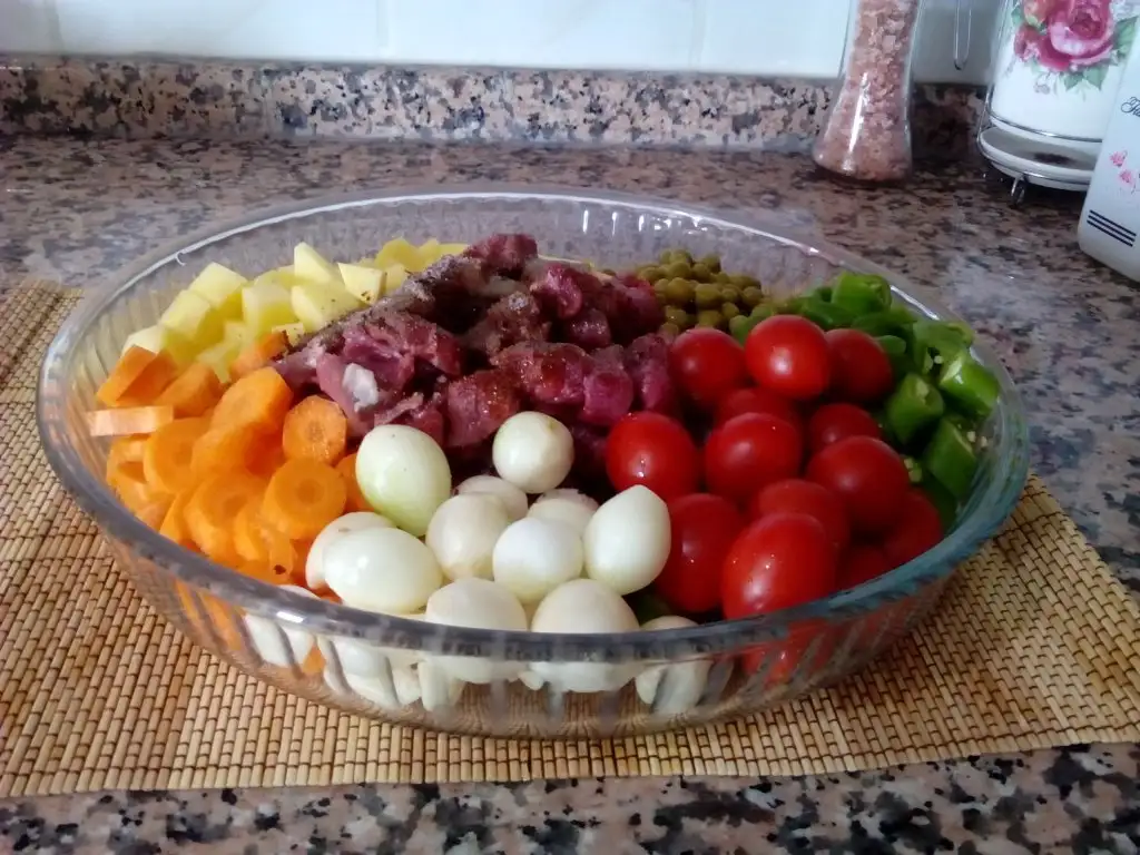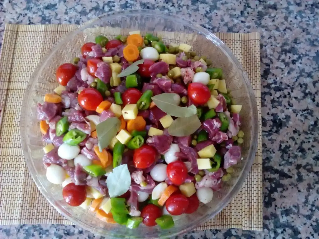 Şimdi bütün malzemeleri bir tepsiye boşaltıyoruz. Damak tadımıza göre baharatları eksiltip veya artırıp etin üzerine serpiyoruz. Son olarak zeytinyağını ekleyip bütün malzemeleri karıştırıyoruz.