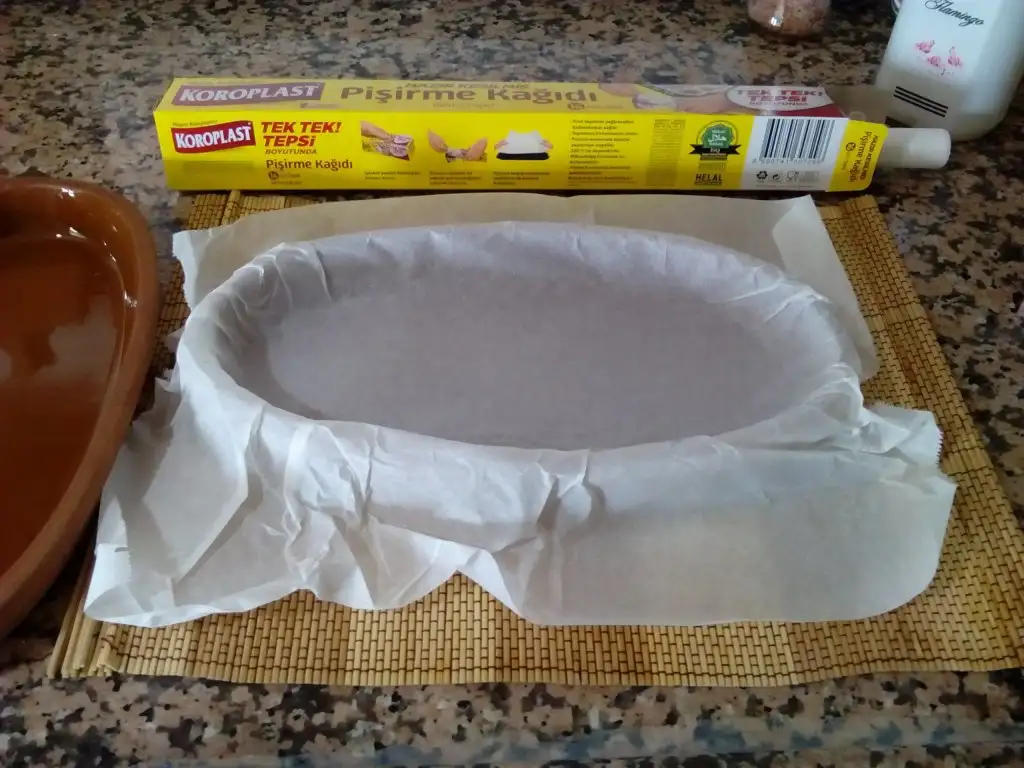Kiremit kabın içine bir adet Koroplast hazir kesilmiş pişirme kağıdını kabın şeklini alacak şekilde yerleştirelim.