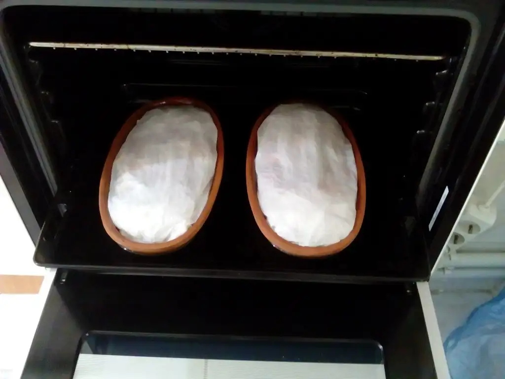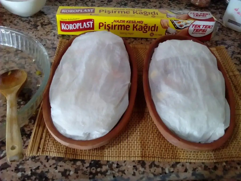 Malzemenin yarısını kabın içine ekleyelim. Kağıdın yanlarını üzerine örtelim.Diger bir kağıdı suda ıslatarak üzerine örtelim. Boşta kalan kısımları nazikçe altına sıkıştıralım.