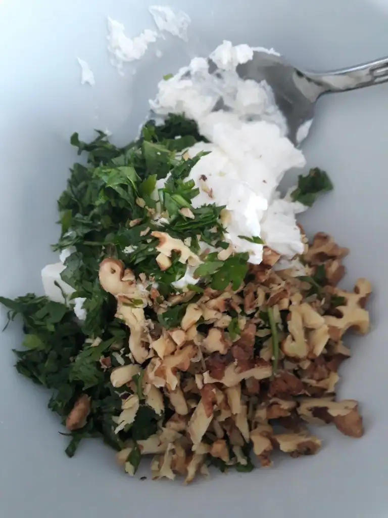 daha sonra peynir,labne,ince kıyılmış maydanoz ve cevizi bi kasede ezerek karıştırıyoruz .