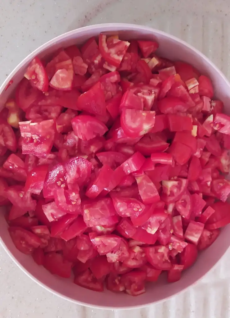 Harmanlayıp 5 dk bekletiyoruz.Bu sırada domates tuz yardımıyla fazla suyunu salıyor.