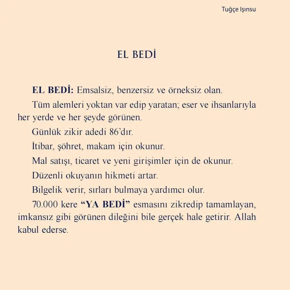 El-Bedî esmasının ebced değeri, zikir sayısı, zikir günü ve zikir saati :