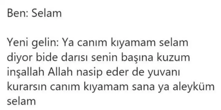 onun 2. Evliliği tamam kardeş biz evde aldık sen bu işi biliyon demeyi çok isterdim ama bu sefer de benim adımı kıskanca çıkaracaktıYeniyılda size whatsapp grubundan attığı mesaj ne kadar da avam! Tam bir görgüsüzlük. Buldumcuk olmuş. Evlenince insanın başı göğe mi eriyor? Nedir yani. Yazdıklarınıza bakılırsa, dosttan çok düşmana benziyor. İstediği kadar ağlasın. Arkadaşlığınızı kesmeniz, üçünüz için daha hayırlı gibi görünüyor.