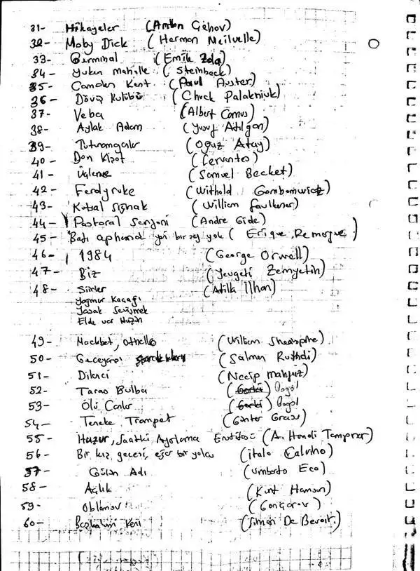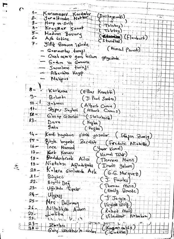 ilk meseja ekledim bende de yeraltından notlar olacaktı, ne zamandır tekrar okumak istiyordum, onu seçeyim, unutmayalım burada tekrar tekrar paylaşalım bu listeyi.Merhaba arkadaşlar, ben de 2 gündür malesef giremeyenlerdenim, elime kitabımı bile alamadım. Bir de dün vahim bir olay yaşandı yaşadığım şehirde, haberlerde denk gelmişsinizdir. Malesef Fen Lisemizin Matematik Öğretmeninin vali ile yaşadığı olaydan dolayı duyduğu derin üzüntü sebebiyle kalp krizi geçirmiştir fakat ardından muhteşem bir 60 kitaplık liste bırakmıştır. Sosyal medyada da anısını yaşatmak için o listeden kitaplar okuyor herkes. Bende de o listeden 5 6 kitap elimde bulunmakta ve yeni okuma listemin başına ekliyorum. Listeyi aşağıya ekliyorum. Kitaplar okunması gereken eserler gerçekten özellikle @marliynmonroe bu listeyi ekleyebilirsin ilk sayfadaki listeye.
