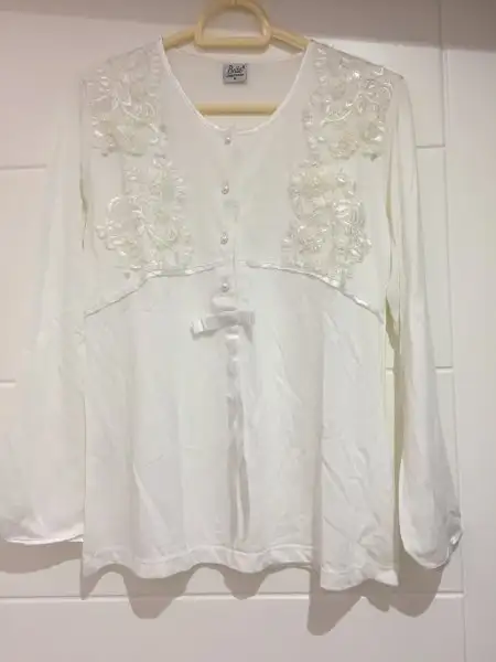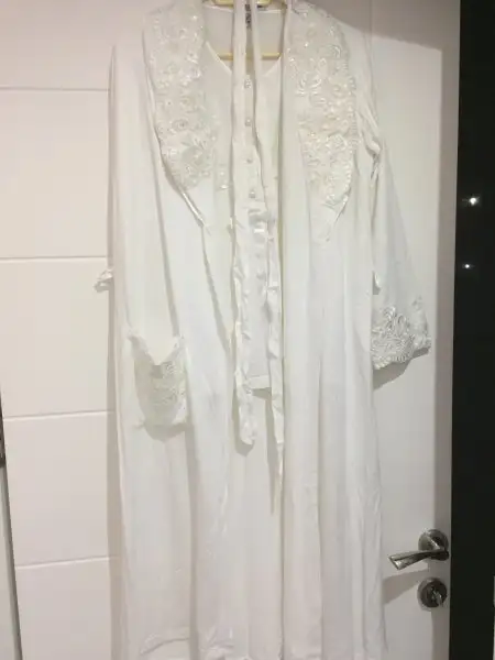 9-)Kullanilmamis lohusa pijamasi,s beden ancak m bedene kadar uyumlu, pijamanin alti duz beyazdir. İsteyene ayrintili foto gonderebilirim. İslemeleri bol ve agir duruyor. 80 tl
