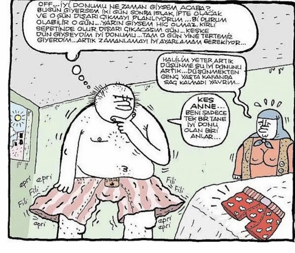Bem her sabah duş alır, yeni bir kifayet giyerim evin içinde de olsam. Tüm gün aynı kıyafeti giydiğinizde birşey mutlaka birşeyler dökülüyor, hele cocuk varsa ve oğlum gibi sümüklüyse, omuz bölgesi mutlaka pisleniyor.Mesela bazı insanın teri kokar vücudu kokar o yüzden hemen giydiği şeyin yıkanmasını ister onu anlarım da günlük duşunu alan kişisel bakımını yapan bir insan ne diye her gün giydiği kıyafeti yıkatır veya sadece 1 kez giyer algılayamıyorum.