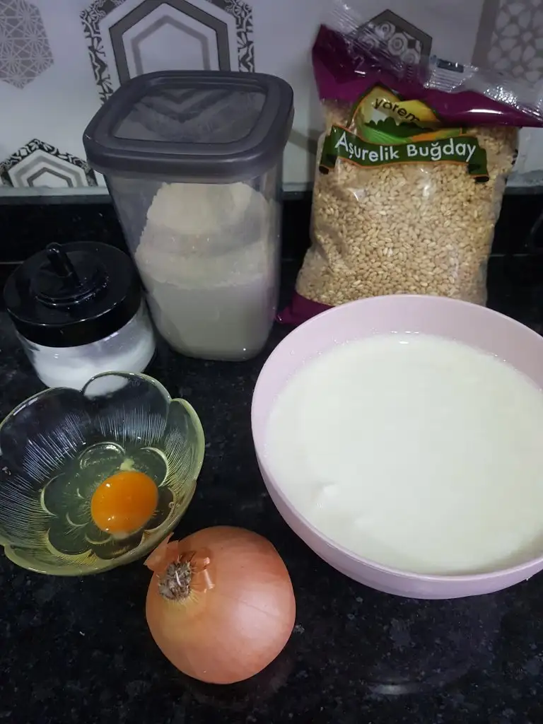 Malzemeler 1 yumurta 3 su bardağı kadar yoğurt bir bardak aşurelik buğday bir kaşık un tuz ve bir kuru soğan