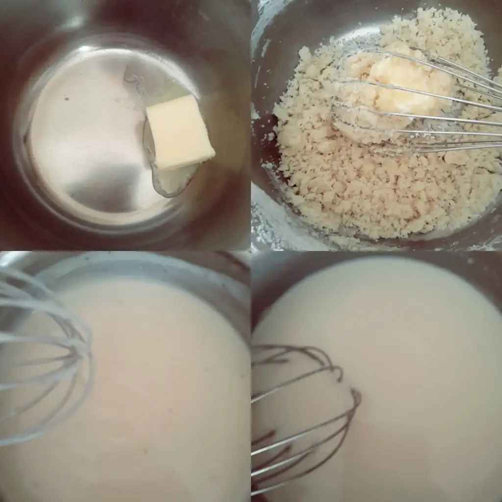 Gelelim Beşamel sosumuza tereyagimizi eritip unumuzu kokusu çıkana kadar kavuruyoruz kavurduktan sonra üzerine yavaş yavaş sutumuzu ilave ediyoruz sürekli karıştırarak pisiriyoruz krema kıvamı aldıktan sonra ocaktan alıyoruz tuz ve karabiber ekleyip karistiriyoruz.