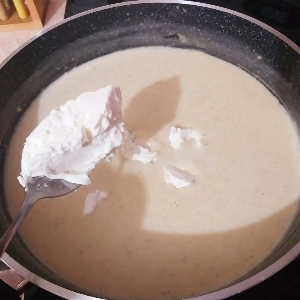 100gr tereyağını eritiyoruz. Erittiğimiz yağ fokurdamıycak aşamadayken 3 yemek kaşığı unu ekleyip kokusu çıkana kadar kavuruyoruz. Üzerine 5 bardak sütün 2 sini ekleyip durmadan karıştırıyoruz topaklanmaması için. Kalan 3 bardak sütüde ekleyip karabiber, ve tuzu ekleyip kaynamasını bekliyoruz. Kaynayan sosumuza 2 kaşık labne ekleyip ocaktan alıyoruz.