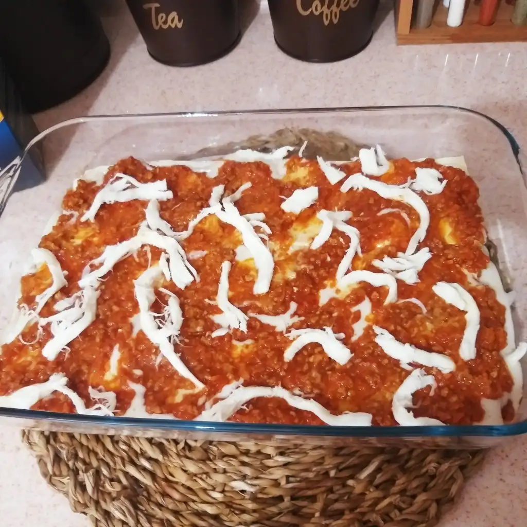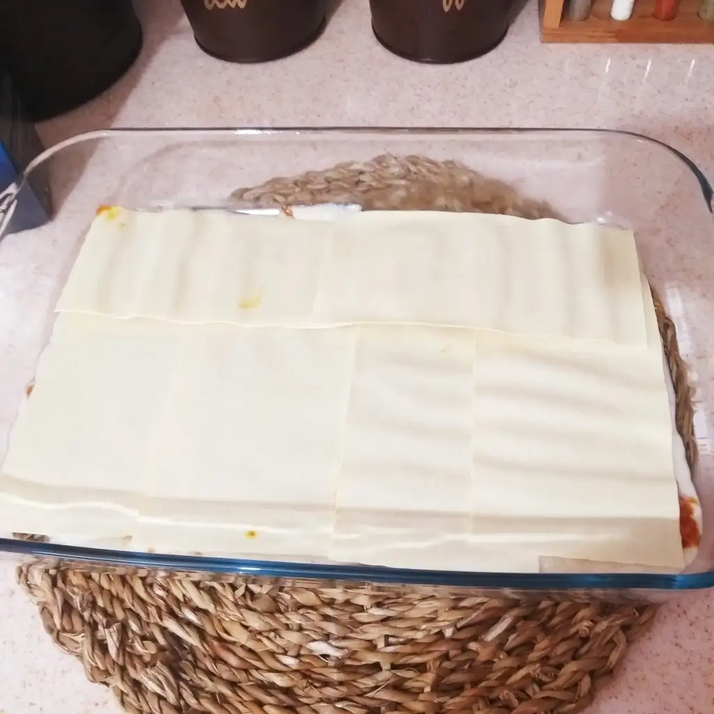 Borcamımızın dibine beşamel sosu ekleyip üzerinede bolones sosunu döktükten sonra hamur katlarımızı diziyoruz.