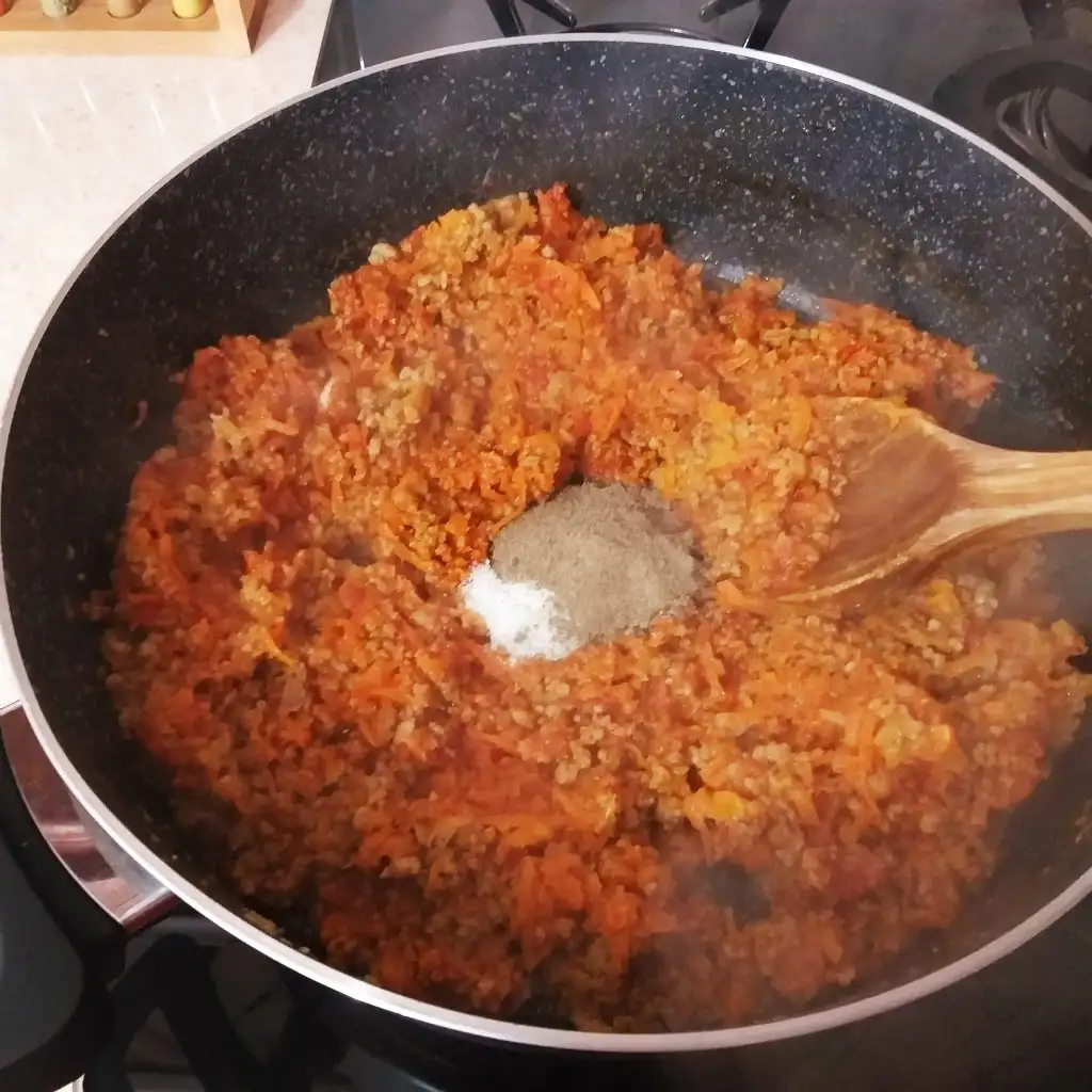 Kavrulan kıymaya zeytin yağını ekleyip kavurmaya devam ediyoruz. Soğan, sarımsak, salçasını ekleyip karıştırıyoruz. Üzerine karabiber, tuz ve rendelenmiş domatesi ekleyip bir taşım kaynamaya bırakıyoruz tekrar.