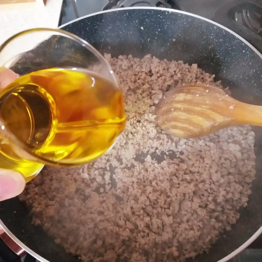 Kavrulan kıymaya zeytin yağını ekleyip kavurmaya devam ediyoruz. Soğan, sarımsak, salçasını ekleyip karıştırıyoruz. Üzerine karabiber, tuz ve rendelenmiş domatesi ekleyip bir taşım kaynamaya bırakıyoruz tekrar.