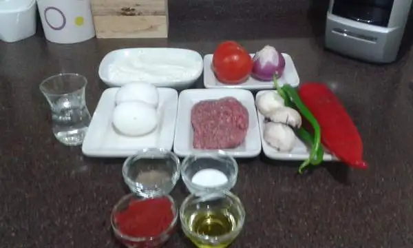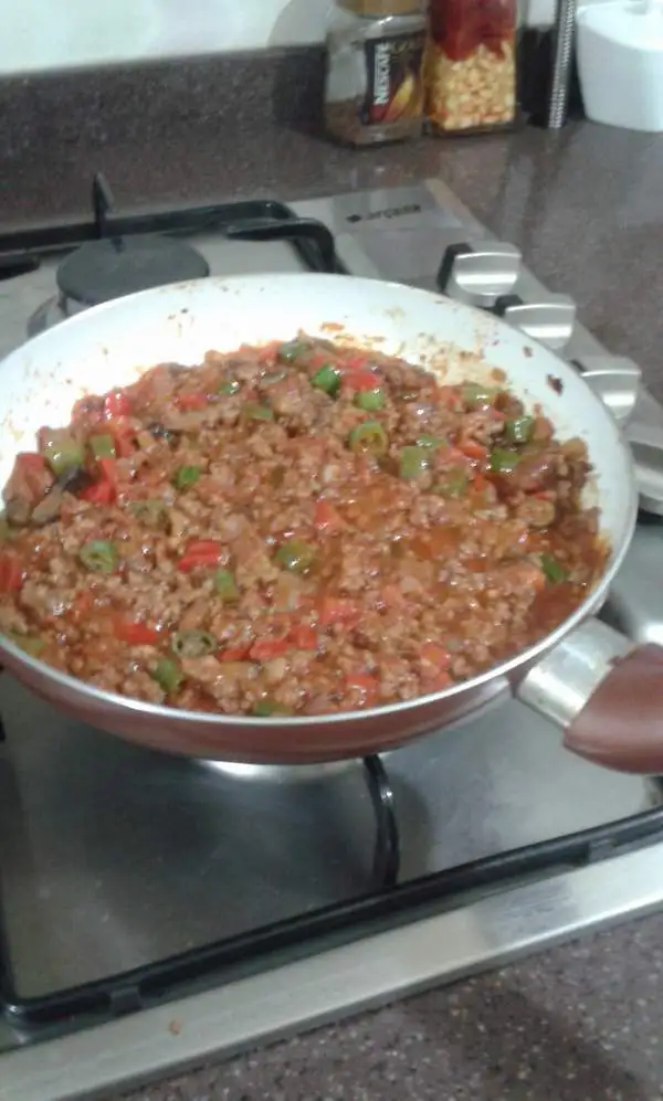 Kıymamızı tavaya alıp pişirmeye başlıyoruz,sonra soğanı ekliyoruz biraz kavruluyor.Mantarı ilave ediyoruz üzerine, yeşil ve kırmızı biberide katıyoruz.Domatesi de katıp biraz salça ilave ediyoruz,baharatlarıda katıp biraz su ilave ederek az bir milktar daha pişiriyoruz.Ocağımızı kapatıyoruz.